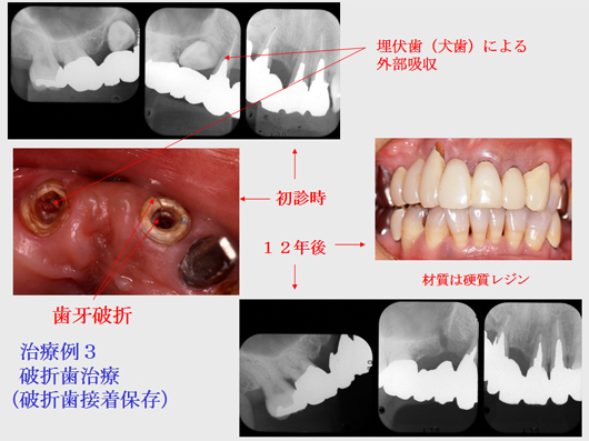 右上の前歯2本はそれぞれ歯根破折と埋伏歯による外部吸収があり、通常は抜歯され